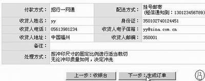 4.生成定单。在图10中单击“下一步”,前往收银台,在付款之前我们还需做一些工作,如选择一种图片处理方式。由于我们选择挂号邮寄,所以还需填上相关的地址信息,如图11。该网站还提供“一单多投”服务,即网站可以帮你将照片寄给你的朋友,你只需留下他们的地址。单击“下一步”,我们可以看到订单的详细内容,如图11。