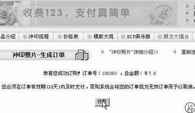 5.付款。在图12中单击“下一步”生成订单,我们看到系统提示“已成功订购”,如图13。此时记住你的订单号,以便查询。同时系统要求必须在10天内支付,否则无效。单击付款,网站会自动链接到招行网站,如图14。点击“确定”。(提示:为了安全,你应该先把足够的金额通过招行网站转到支付卡上,付款时把其他窗口关闭)过一会儿,系统提示支付成功,此时你可以单击图2的“我的订单”进行查询,福建的朋友还可以通过8008581169免费查询。至此一切OK!过几天,你便可以收到照片了。