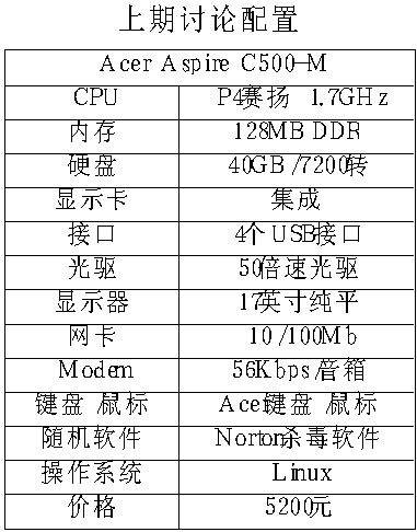 吴俊(广西参赛剑客):这款Aspire C500-M从配置上看应该是定位于家用上网的机型。整机配置上没有较大瓶颈,可以说是上网型的典型配置。因为上网型机器不同于娱乐型机器,上网型机器对CPU、内存和显卡要求都不是很高。所以这台机器的CPU、内存和显卡基本上都能够满足日常上网的这一要求。当然,如果内存能升为256MB那就更好了。上网型机器对硬盘有些要求,就是要高容量高速度,只有高容量的硬盘才能存放下从网上不停Down下的东东。而且上网型机子最好能配置一台刻录机,只有这样才能把网上Down下来的东西更好地保存起来。在这方面,这台机子做得不够。40GB的硬盘只能是勉强够用。因为宽带在国内逐渐成熟,所以标配10/100MB自适应网卡是很正确的,而56Kbps的Modem就给人以鸡肋的感觉。在软件方面配以Linux的操作系统,从这点可以看出这是商家用来降低整机价格的一个措施,因为Linux系统价格很便宜,但是Linux系统在上网方面的易用性远远比不上Windows操作系统,实用性不大。而配以Norton杀毒软件则是正确的选择,不过个人认为作为国内用户,KV3000等国产杀毒软件才是更好的选择。作为Acer的品牌机,做工毋庸置疑,但是5200元的价格有些偏高。
