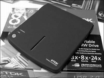 最后我们来见识一下TDK的超轻薄外置刻录机。一提起TDK,大家就想到黑色,这款外置刻录机也是沿用了TDK惯用的黑色,看上去很酷!它非常薄,只有15mm厚,是这三款外置刻录机中最薄的。它采用USB2.0接口,支持8×写/8×覆写/24×读。这款刻录机的价格也是三者中最便宜的,现价仅1299元。不过,听说是促销,以后价格要上涨!需要的朋友赶快抢吧(图3/图4)。