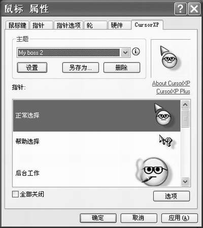 安装完成后,在控制面板中选择“鼠标”项。这时你会发现它的里面增加了一个“CursorXP”标签(图1)。在此标签的“主题”栏的下拉菜单里有十几种鼠标主题可供选择,如手形、齿轮形、绳子形等等。