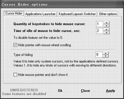 在“Cursor Hider”标签下的“Time of idle of mouse to hide cursor.sec”项后调整指针等待的时间(默认时间为两秒)。在“Applications Launcher”标签中,我们能够把键盘上的“Num Lock”、“Scroll Lock”和“Caps Lock”三个键设置成启动某个应用程序的快捷键。设置好后,连续按两次这个键就会启动对应的程序。启动后鼠标会自动隐藏。