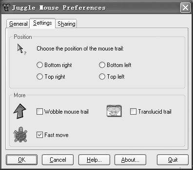 选择“Settings”标签。在“Position”项下面,可以设置鼠标跟随同鼠标指针的相对位置。此外,我们还可以使用“More”下的“Wobble mouse trail”、“Translucid trail”和“Fast move”项来调整跟随效果的晃动与否、透明程度以及移动的快慢。