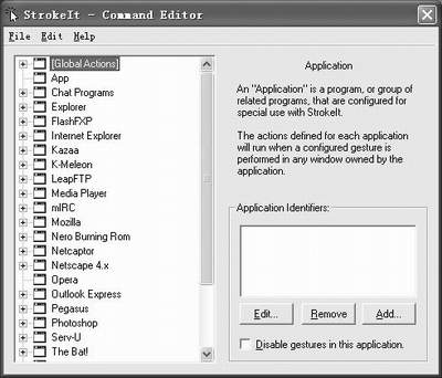 就拿Internet Explorer来说吧!在它下面有两项,即Back [Left]和Forward [Right]。前者表示在IE中,我们只要按住鼠标右键向左做画线动作,就可以快速返回到上一页;后者表示按住鼠标右键向右做画线动作,就可以快速转到下一页。另外,你还要仔细看一下列表框中的“Global Actions”项。此项内包含了Windows中常用操作所对应的鼠标动作。这些动作命令对所有窗口均有效。