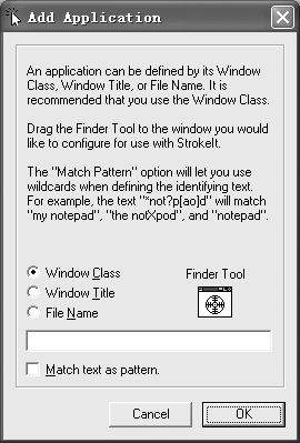 2.点击界面右下方的“Add”按钮,这时会弹出“Add Application”对话框(图7)。在Windows Class、Window Title、File Name三种方式中选择“Windows Class”。然后点击“Finder Tool”下面的圆形图标,并按住鼠标左键将它拖动到“Foxmail”的主窗口中,当我们在下面的空白栏里看到“TFoxmail_Main”字样时,说明软件已经识别出“Foxmail”的窗口了(在进行本步之前,要先启动Foxmail)。