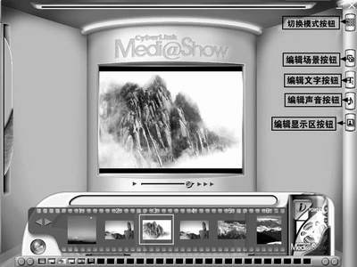 2.现在我们要做的就是为我们的图片添加各种效果了。首先单击“工具栏”中的“切换浏览/编辑模式”按钮,切换到编辑模式(图2)。选中编辑区中的第一幅图片,点击“工具栏”中的“编辑场景效果”按钮,这时会打开一个“场景编辑”窗口(图3)。在窗口中有近百种场景效果可供选择。选择其中的一种效果后,在窗口下方的预览框中可以预览选中的效果。在窗口的中间还有一个滑动杆,它是用来控制场景效果的停留时间的。