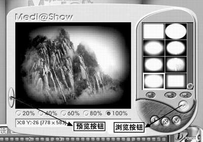 5.点击工具栏中的“编辑显示区域”按钮,打开“区域编辑”窗口,在该窗口中有两种编辑效果供我们选择,编辑显示区域效果和编辑掩码效果。编辑显示区域效果是指,把图片中不要的部分直接切除,而所谓掩码效果是指,通过掩盖图片的部分显示区,来突出图片中的重点(图6)。在窗口中选择一种掩码效果,然后再点击“预览”按钮,即可看到设置后的效果(再次点击“预览”按钮,将会切换到编辑显示区域状态,掩码效果将被取消)。如果你自己制作的有这种掩码效果图片的话,可以点击窗口中的“浏览”按钮找到自己制作掩码图片,然后点击“确定”即可。