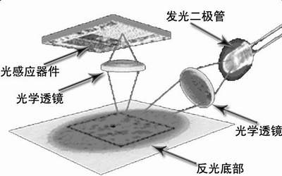 光电鼠标与机械鼠标最大的不同之处在于其定位方式不同。在光电鼠标内部有一个发光二极管,通过该发光二极管发出的光线,照亮鼠标底部表面(这就是为什么鼠标底部总会发光的原因),然后将底部表面反射回的一部分光线,经过一组光学透镜,传输到一个光感应器件(微成像器)内成像。这样,当光电鼠标移动时,其移动轨迹便会被记录为一组高速拍摄的连贯图像。最后利用光电鼠标内部的一块专用图像处理芯片(DSP,即数字信号处理芯片)对移动轨迹上摄取的一系列图像进行分析处理,通过对这些图像上特征点位置的变化进行分析,来判断鼠标的移动方向和移动距离,从而完成光标的定位(图8)。