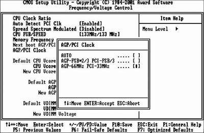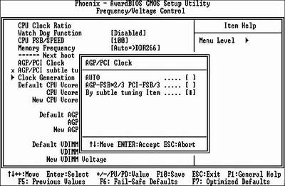 2.选中AGP/PCI Clock的选项,回车之后,会弹出一个对话框,里面有3个选项(如图1):