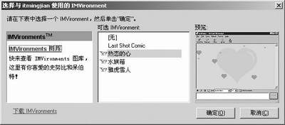 IMVironment 是即时信息窗口中的动画背景。可以用来传递你的情感、玩互动游戏、或共享独有的照片、音乐和其他形式的媒体。