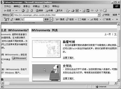 在Yahoo! Messenger中有一个即时背景功能IMVironment,这是一个动态的背景功能。在IMVironment中可以根据不同的用户设置新的背景,为我们聊天增添不少光彩。