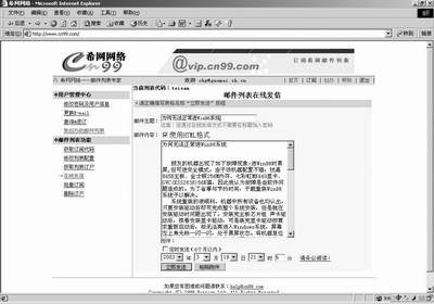 这是希网推荐的发行方式,“电子杂志编辑系统”(如图3)是由希网自行开发,专用于希网网络邮件列表的编辑、发行工作的软件。用户根据需要可建立自己的电子刊物模板。使用该系统可以生成统一、美观的电子刊物,大大简化邮件列表的编辑及发送工作,减少不必要的重复劳动。有关该软件的使用方法,各位可参见软件帮助系统,这里就不啰嗦了。下载地址:http://www.cn99.com/listedit/listedit.zip(1.8MB)。