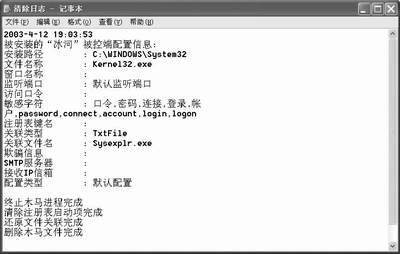 冰河陷阱启动时,会自动检测系统中是否已经被安装了各种版本的冰河被控端程序,如果一旦发现的话,将弹出对话框进行警告,点击“是”按钮将自动清除被控端程序,在清除之前会向用户显示已被植入系统的冰河被控端程序的配置信息,清除结束后会显示一对话框,你可以从当前目录下的“清除日志.txt”文件中查看相应内容(如图),够清晰吧?
