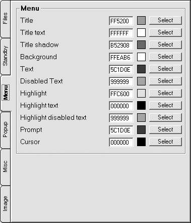 1.打开Themes Creatorde,选择左边的Menu标签(图9),我们依次可以看到能够修改菜单的标题颜色、标题文本颜色、标题阴影颜色、背景颜色、文本颜色等等。