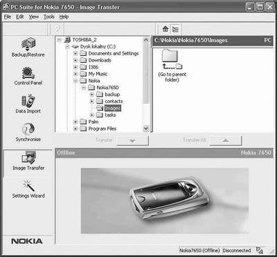图像管理:使用“图像管理”,我们可以复制、移动、重新命名和删除手机及PC中的图像文件(照片和图片)。“图像管理”窗口中有两个主要区域。PC图像文件和文件夹显示在窗口上半部。当手机连接到 PC时,窗口下半部会显示手机中的图像文件和文件夹。如果没有连接手机,会显示一个图标,以表明脱机状态,这个功能也和7650的PC套件相似。