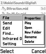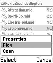 对应于不同的文件,菜单里还会多出不同的项目,在声音文件上会多出“Play”(图9),图形文件上会多出“View”、“Set Wallpaper”和“Set as operator logo”。用“Set as operator logo”可以更换运营商的图标LOGO,7650能用的LOGO大小是97×25像素。注意,这里的“Set Wallpaper”只是替换SeleQ软件自身的背景图,而不是更改手机的桌面(图10)。