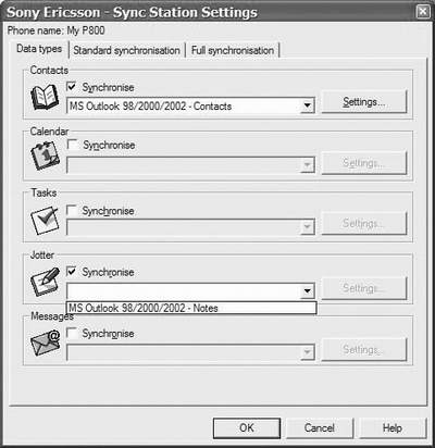 3.我们需要对OutLook进行同步设置(图17)。可以进行的同步设置选项包括:Contacts(名片夹),Calendar(日历),Tasks(任务),Jotter(记事本),Messages(信息)。