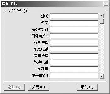2.要添加联系人,只要点击工具条上的第1个增加新卡片按钮(图15),就会弹出增加卡片窗口(图16),只要在各个项目中填充信息,就可以了,完成后点击“增加”按钮确定。这个过程可以重复进行,直到我们在“增加卡片”窗口中点击关闭为止。