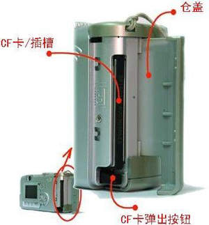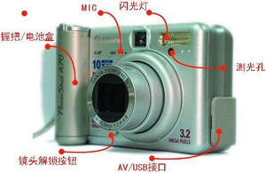 体积和重量上的变化使得A70的造型也随之改变。机身正面的手柄突出部分很显眼,实际上它和A40一样还是采用4节5号电池驱动,因此突出的手柄和电池舱结合在一起,空间利用得挺好。它的镜头还是采用了A40的佳能“Zoom Lens 3×”(图2),它的镜头环是可以取下来的,镜头左下边有一个镜头环解锁按钮,按下它就可以拧下镜头环,佳能G3也是采用的这种设计。