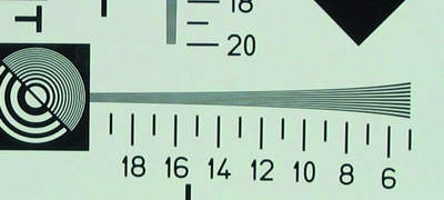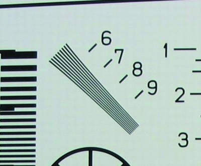 从图中可以看出A70在水平分辨率上的表现一般。小编对比了以前数码相机测试的结果,A70水平分辨率逊色于佳能S45,和佳能V3的比较接近。在垂直分辨率方面,测试线条在收敛端有发虚的现象。