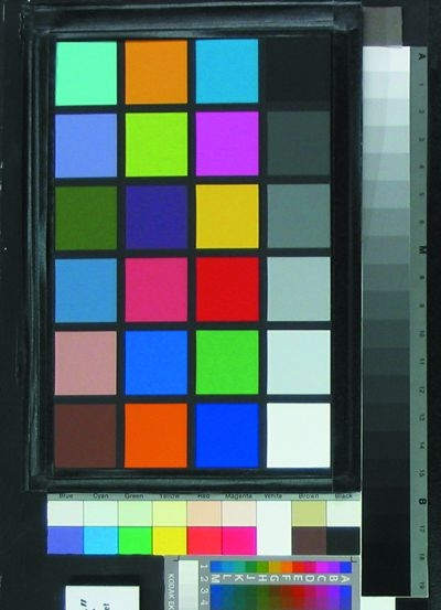 小编使用了国际通用的柯达ColorChecker色卡在日光条件下(色温5500k)对A70进行了色彩还原测试,然后将拍摄的照片在Photoshop下打开,用取色笔读取相应的色块数值,再和色块标准三原色数值进行对比,均值计算出偏差。拍摄效果如图8所示: