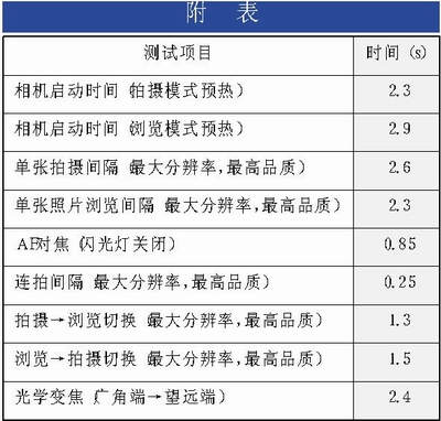 它采用了新型的DiGiC处理器和iSAPS智能场景分析系统,感光度范围增大为ISO50~400,实际像素320万。不过小编更关注在速度方面的提升,在下面的实测中会有这方面的内容(见附表)。