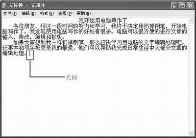 在了解了光标的用途和移动方法之后,我们可以开始输入文章了。比如输入:“我开始学习用电脑写作了……”看着自己的“大作”一点一点地出现,是不是感到很兴奋。由于记事本只提供了最基本的文字编辑功能,所以我们在输入过程中要注意以下两点: