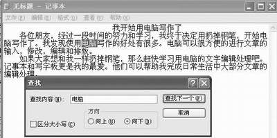 如果文章打得很长,想查找是否有特定的文字或者句子,可以使用查找功能。如我们要查找“电脑”这两个字,可以选择“搜索”菜单中的查找,然后在弹出的查找对话框中输入查找目标“电脑”,选择查找的方向是从光标处向前还是从光标处向后查找(图2)。如果是英文的话,还可以选择是否区分英文的大小写,然后按查找。如果找到符合条件的文字的话,就会自动选中第一个文字或句子。记事本可以方便地将文章的多处相同的文字替换成指定的新内容。如:我们要将“电脑”替换成“计算机”可以选择编辑菜单中的替换,或按快捷键“Ctrl+H”。在弹出的对话框中(图3)的“查找内容”输入“电脑”,然后将替换为输入“计算机”,按替换键就可以将查到的第一个“电脑”替换为“计算机”。如果按全部替换键,可以将文中的所有“电脑”替换为“计算机”。注意:替换中的查找方向只能从光标处向下进行查找替换。