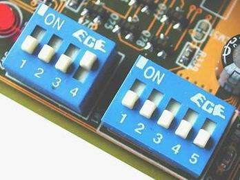 另一种跳线称为DIP开关(图2)。DIP开关与一般跳线相比,使用起来比较方便,就像开关一样上下一拨就可以了。另外它的结构比较紧凑,能提供的选择也比较多,可以使主板布局比较简洁,因此使用也越来越广泛。