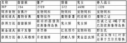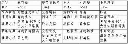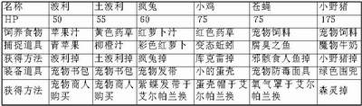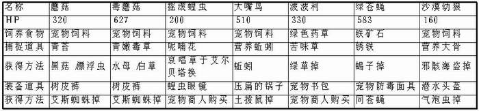 下面是与宠物相关的资料,包括相应的捕捉道具和饲养道具以及这些道具的获得方法。