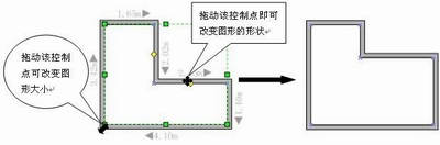 从墙壁、外壳和结构模具中,将一个外墙形状图形或房间形状图形拖到绘图页上。通过拖动外墙形状端点或各个墙壁上的控制手柄来调整墙壁或房间形状的大小(如图2所示)。也可以通过在自定义属性窗口中指定属性来对图形形状进行修改。