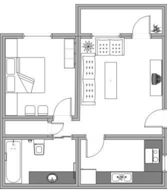 3.家具摆放。绘制好建筑平面图后,你就可以从家电、卫生间和厨房平面图、橱柜等模具中,将需要布置的“家具”形状拖到当前图形中,如果“家具”摆放的方向不妥,可以用右键单击需要改动的形状,在弹出的快捷菜单中选择形状中的左转、右转等项进行调整。