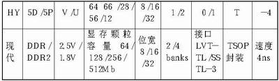 有一次帮朋友试显卡,我把自己这块显卡拆了下来,一看显存,是HY的,共有4颗,上面的技术参数是“HY5DV641622AT-4”。我查了相关资料,HY显存具体意思见下表: