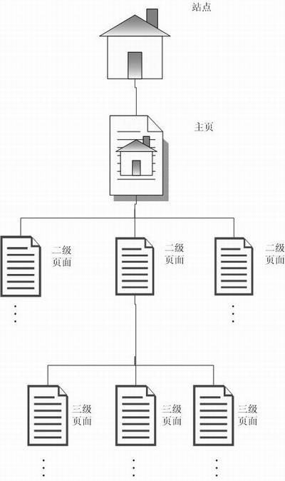 有了以上的准备工作,我们还别急着动工,因为需要对网站进行整体思考策划,例如有哪些内容,例如我们把首页比喻成“客厅”,那其他的二级页面就是“卧室”之类的,当然,如果你有三级甚至更多层的页面都应先考虑。下图是简单的个人主页的结构图 (如图1)。在图1中,三个句点是代表此处还可以有下一级页面。