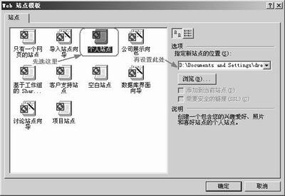 2.在图2所示的窗口中选择“个人站点”,右边有一个“指定新站点的位置”下拉框,单击“浏览”按钮,在弹出的对话框中选择我们要定义为站点的文件夹,在此我们选择“C:\myweb”(事先建立的,如果还没有,事先要建立)为站点。