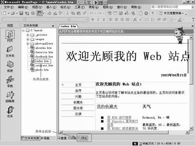 然后单击“确定”FP即可开始创建站点。等站点创建完毕后,模板会自动给我们创建六个页面:索引页(index.html)、个人收藏页(favorite.html)、信息反馈页(feedback.html)、图片页(photo.html)、个人兴趣爱好页(interest.html)、自序页 (aboutme.html)。在窗口中双击“index.html”,再单击图中的“预览”按钮,我们就可以看到我们的“处女之作”了,如图3所示。
