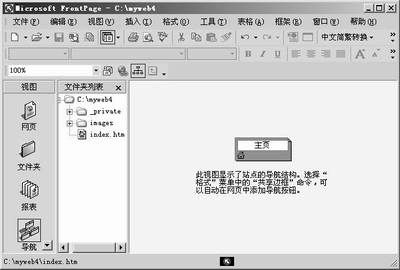 1.单击主窗口中“视图”栏中的“导航”图标,切换到“导航”视图。由于目前站点没有定义任何网页,所以此时的站点空空如也,什么也没有,如图5所示。