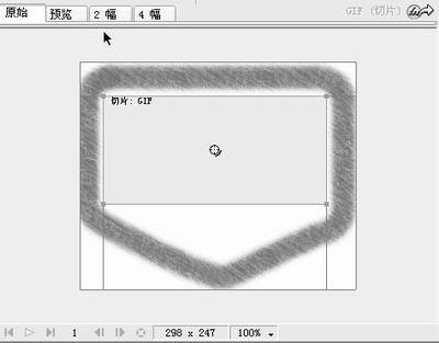接下来开始操作,这里以Firework MX和Dreamweaver MX为例。首先打开Firework MX,新建一块画布。然后根据你的构思,画一个可以用来修饰文字的框。点击工具栏左下角的“切割”图标(如图1)。再把鼠标移到框中,在你想要写字的地方按住左键,拖动鼠标选定这块地方,(如图2)。此时系统会根据你的操作自动分割其他的部分。选择好图片的格式和压缩比率后,按“文件”项进行导出。因为经过分割的图片已不再是一个图片文件,而是以表格的形式把分割出来的图片保存在网页里,所以导出的为网页格式HTML。