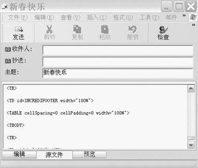 ②在编辑窗口中,我们可以随意添加所需要的图像、声音等。然后将电子邮件的所有源代码选中,执行“复制”命令,准备在邮件软件中使用。