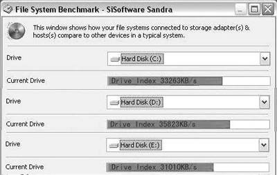 3.磁盘性能上,1945E表现得相当出色,一般笔记本电脑用的都是4200转或5400转小硬盘,因此磁盘性能表现不佳,当使用了7200转的台式机硬盘后,用SiSoftware Sandra测得分数如图6所示。