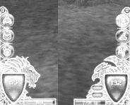 检查了一下游戏的控制面板,还好,很多东西都是比较熟悉的。左边红色的盾形框代表了血值,右边蓝色的盾形框则代表了魔法值。在盾形框的上面分别有3个按钮,我点击后了解到左边的3个从上往下依次为角色状态、包袱栏和装备栏,右边则是跑步行走切换、攻击切换和站立坐下切换按钮。这里,说一下攻击切换。在《魔剑》的世界中,你必须要和平地与你的朋友们相处,所以我在开启攻击模式下是无法和城市中的商人们正常对话的,这会让他们觉得不愉快。反之,在面对敌人进入战斗时,要尽快地开启战斗模式以便作战,这点和UO很像。