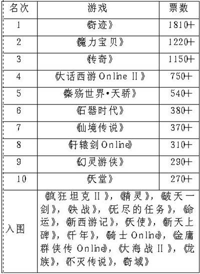 不仅是整个国内的网络游戏市场竞争激烈,这种现象也影响到了我们的网络游戏热门排行榜活动。从第六名开始,几款网络游戏上上下下,有的被挤出了排行榜的前十位,有的则一战成名。除了排名六至八位的《石器时代》、《仙境传说》和《轩辕剑Online》得票占有一定优势以外,排名第九、十位的《幻灵游侠》和《天堂》,并没有和入围游戏拉开太大的差距。值得一提的是《天堂》首次入围,应该给予鼓励,但同时也要小心在后面紧追不舍的诸多网络游戏。