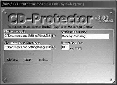 1.运行CD-Protector之后,在图3所示的窗口中分别设置“File to encypt”(需要加密的文件)、“Custom Message”(出错提示信息)、“Phantom Trax directory”(输出保存路径)等选项,同时在“Encryption Key”对话框中输入00至FF的两位字符串作为加密密钥。