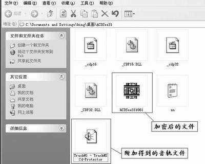 2.完成上述设置后点击红色的“ACCEPT”按钮,这时CD-Protector将对选中的源文件进行加密操作,加密结束后在原先的文件夹中可以看见源文件图标已经更换为CD-Protector特有的标志,而且还多出了一个附加得到的音轨文件(图4)。