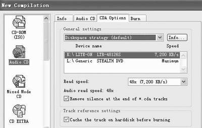 ②在“CDA Options”标签中勾选“Remove silence at the end of *.cda tracks”(清除*.cda音轨末尾的静音)和“Cache the track on harddisk before burning”(刻录前在硬盘上缓存音轨)两项(图5)。