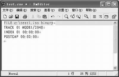(3)接着我们就需要制作相应的CUE文件了。其实CUE文件只是一个普通文本文件,只是扩展名为*.cue,比如对于我们制作的test1.iso文件来说,对应的test1.cue文件内容如下(图11):