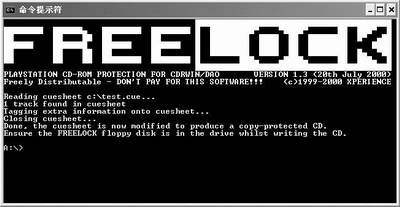 把我们制作的FreeLock软盘放进软驱里,进入DOS窗口运行“a:\freelock c:\test1.cue”命令,当屏幕上出现图12所示的窗口则表示这个CUE文件已经被FreeLock修改好了(图12)。