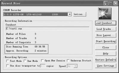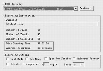 在得到了修改过的CUE文件后,接下来就要把这个镜像文件刻录到光盘中了。出于方便考虑,我们还是通过CDRWin进行刻录。首先在CDRWin中点击“Record Disc”按钮,并且点击“Load Cuesheet”按钮加载我们刚才制作得到的test1.cue文件,这时将分别看见图15和图16所示的窗口。虽然test1.iso源文件没有更改,但是最终的镜像文件差别很大,这也就是两种加密方法的差别所在。