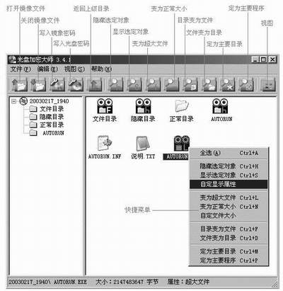 通过以上的操作,我们已经掌握了几种常见的光盘加密方法。在这里笔者推荐一款能够制作个性化加密光盘的光盘加密大师。作为一款加密光盘软件,光盘加密大师可以直接修改光盘镜像文件,比如把光盘镜像文件中的目录和文件特别隐藏、将普通文件变为超大文件,或者把普通目录变为文件目录,因此在它的帮助下我们可以轻松制作自己的个性化加密光盘。