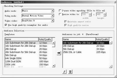 重要的是右边“Audiences in job”选择框中有四个现成视频方案。显然这样低的码率不能适应我们对视频质量的高要求,于是按“Del”键把它们全部删除。之后从左边视频备选框(Audience Selection)中选出满意的码率方案。